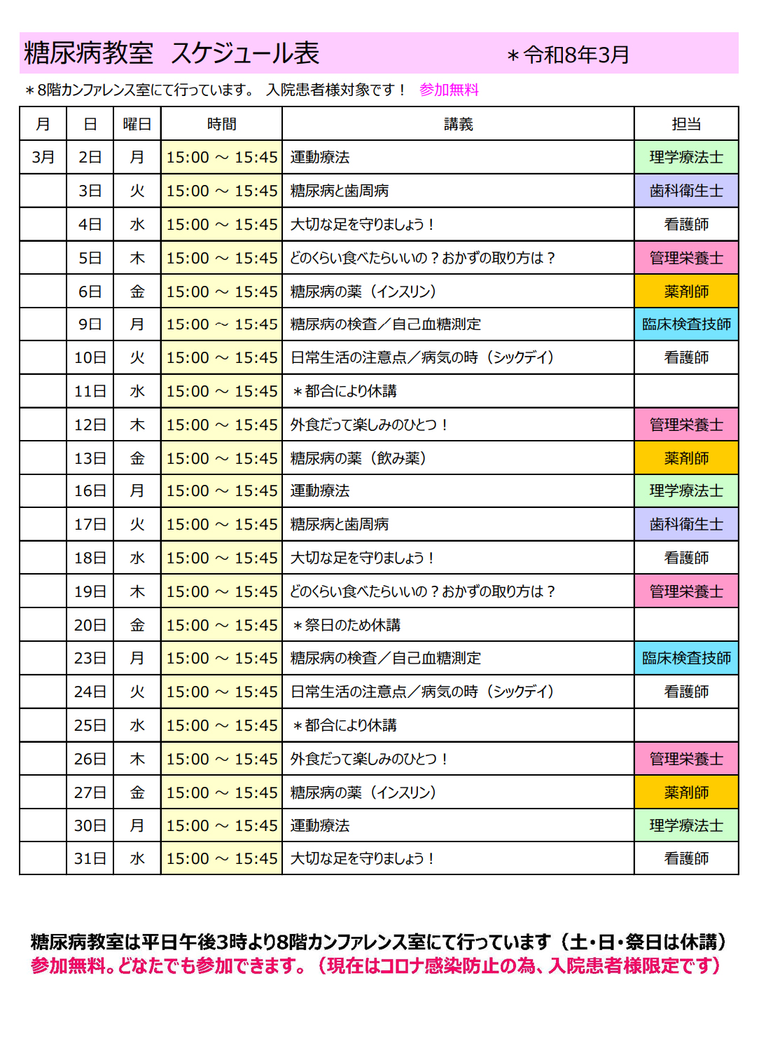 糖尿病教室のスケジュールを更新しました (現在はコロナ感染防止の為、入院患者様限定です)